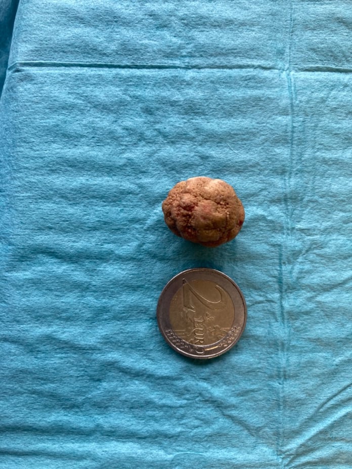 De blaassteen werd chirurgisch verwijderd via een incisie in de blaas. De steen was bijna even groot als een €2-muntstuk.