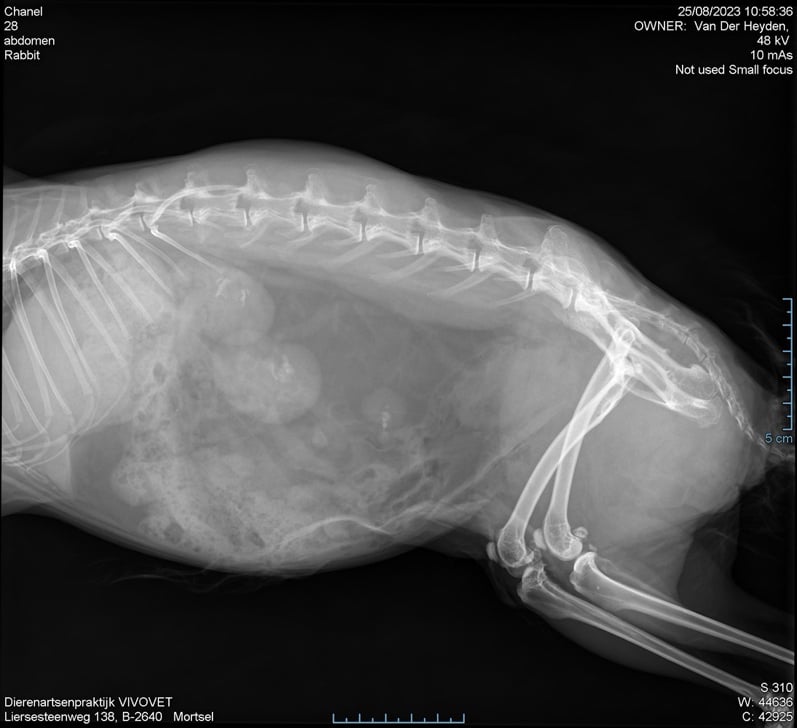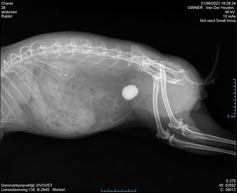 Uit het klinisch onderzoek bleek al snel dat haar buik heel gevoelig was ter hoogte van de blaas. Haar blaas was heel groot en voelde hard aan. Bijkomend was het konijntje ok veel te zwaar ten gevolge van haar sterilisatie 1,5 jaar geleden. Er werd besloten om met behulp van een RX een blaassteen uit te sluiten. Konijnen met obesitas zijn namelijk gepredisponeerd voor het ontwikkelen van blaasstenen. In combinatie met haar klachten was hier een grote kans toe.