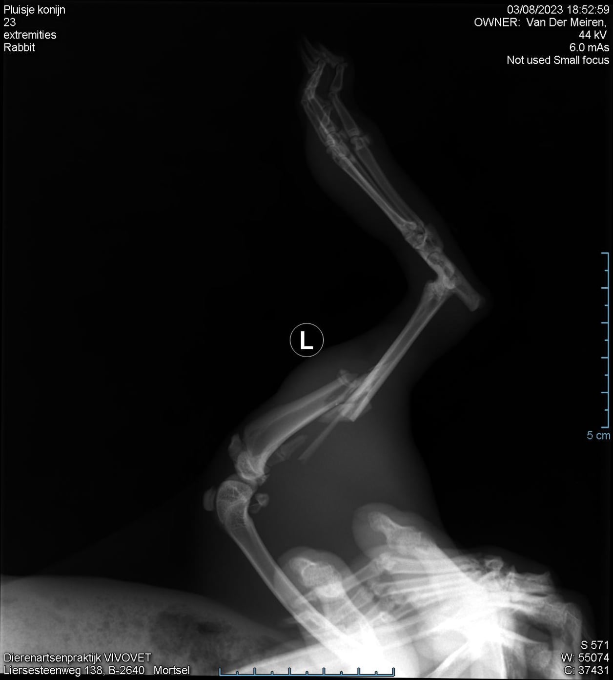 Dit konijntje (6 maanden oud) werd gevonden in de tuin met een scheef pootje. De eigenaar had onmiddellijk door dat er iets mis was en kwam diezelfde dag nog naar de praktijk voor controle. Al snel werd duidelijk dat de achterpoot gebroken was en er verdere stappen ondernomen moesten worden.
